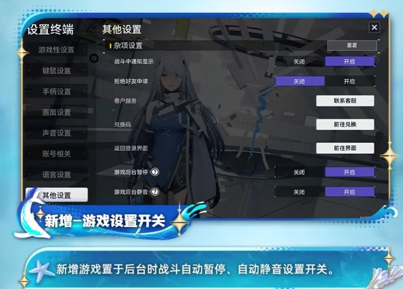 新增-游戏设置开关:新增游戏置于后台时战斗自动暂停、自动静音设置开关,提升游戏的便捷性。