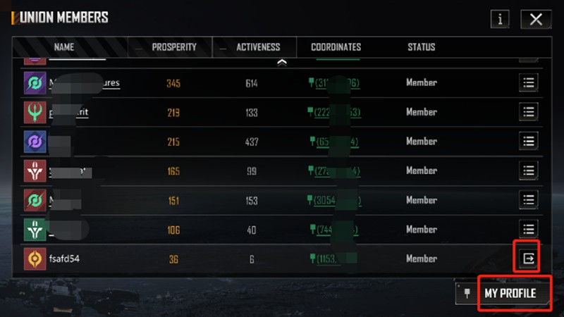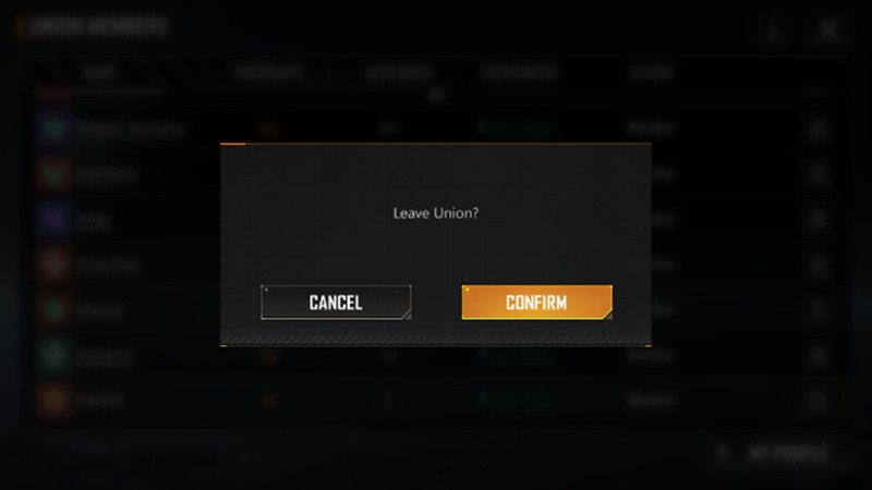 在成员管理界面中,向下滑动列表,找到最底部的“MY PROFILE”选项并点击。这个选项会直接定位到你当前的个人资料位置,方便快速操作。当你点击自己角色名称右侧的功能按钮时,系统会弹出一个提示框,内容为“Leave Union?”,询问是否确认退出当前联盟。