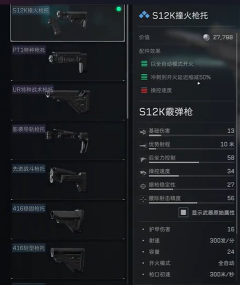 S12K作为三角洲行动中极具代表性的近战霰弹枪,其高爆发、短间隔的射击特性让它在贴脸交火中占据绝对优势。然而连续开火带来的后坐力问题不容忽视,影响了连发时的命中精度。为了解决这一痛点,枪托的选择尤为关键。在众多配件中,撞火枪托是目前最适合S12K的配置之一。它能够有效缓解快速连射时的后坐反馈,让手感更加平稳,避免因枪械抖动导致的输出中断,从而维持持续火力压制。