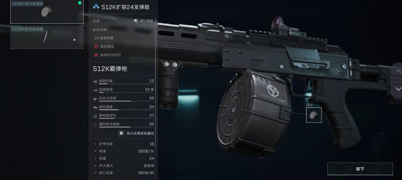 弹药容量是决定S12K持续作战能力的核心因素。默认弹匣容量有限,在激烈交火中极易出现中途断弹的情况,严重影响生存率。因此,将原装弹匣替换为24发弹鼓成为改装中的必选项。虽然弹鼓会略微增加武器重量,降低移动速度,但换来的是成倍提升的火力续航。在团队混战或据点争夺场景下,多几发子弹往往意味着多一次反杀机会,减少换弹频率也能降低暴露风险。