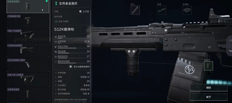 握把的搭配直接影响S12K连发过程中的操控表现。面对高射速带来的枪口上扬问题,垂直握把展现出出色的稳定性加成效果。该配件能显著抑制枪口垂直跳动,使连续射击时的弹着点更加集中。尤其是在室内推进或转角遭遇战中,稳定的枪身控制能让每一次喷射都精准落在敌人身上,而不是浪费在墙壁或天花板上。对于依赖快速连喷建立压制的打法而言,垂直握把几乎是不可或缺的存在。