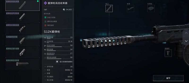 枪管部位的改装应聚焦于提升命中效率而非改变射程本质。在三角洲行动中,霰弹枪涡流收束器是S12K枪口的最佳选择。该配件能够压缩子弹扩散范围,提高单位面积内的弹丸密度,从而增强单次射击的伤害转化率。在中近距离交火中, tighter 的弹道分布意味着更高的命中概率和更强的击杀确定性。配合撞火枪托与垂直握把,涡流收束器进一步夯实了S12K作为精准近战火器的定位。