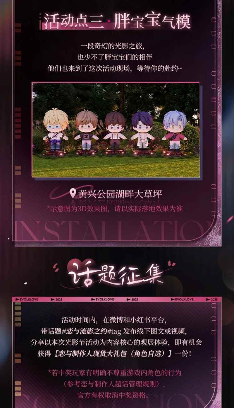 活动时间内带话题#恋与流影之约 发布线下打卡图文或视频,分享以本次光影节活动为内容核心的观展体验,即有机会获得【恋与制作人现货大礼包(角色自选)】一份!