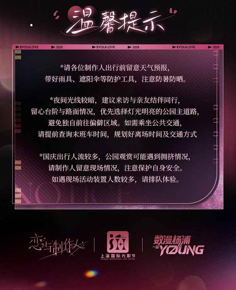 假期天气多变,出行人数较多,请制作人以出行安全为第一考虑要素,夜间前来观赏灯光装置时与亲友结伴出行,优先选择灯光明亮的公园主道路进行游览。公园内美陈装置与互动活动也将视天气情况有所调整,给制作人造成的不便,还请谅解。