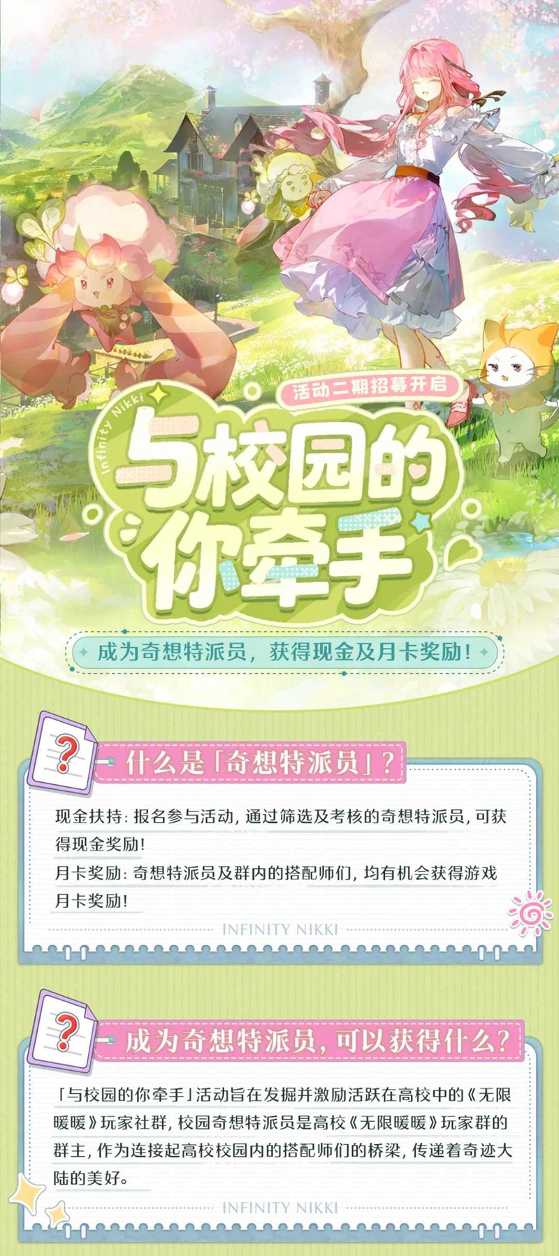 无限暖暖「与校园的你牵手」活动二期招募开启~如果你正在运营高校《无限暖暖》玩家交流群,就有机会成为校园奇想特派员,作为连接起校园内搭配师们的桥梁,传递关于奇迹大陆的美好 。一起来和小编看看吧~