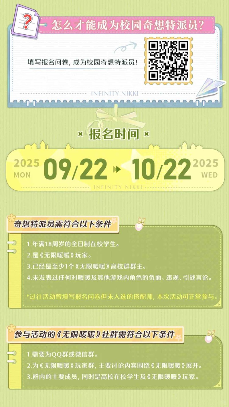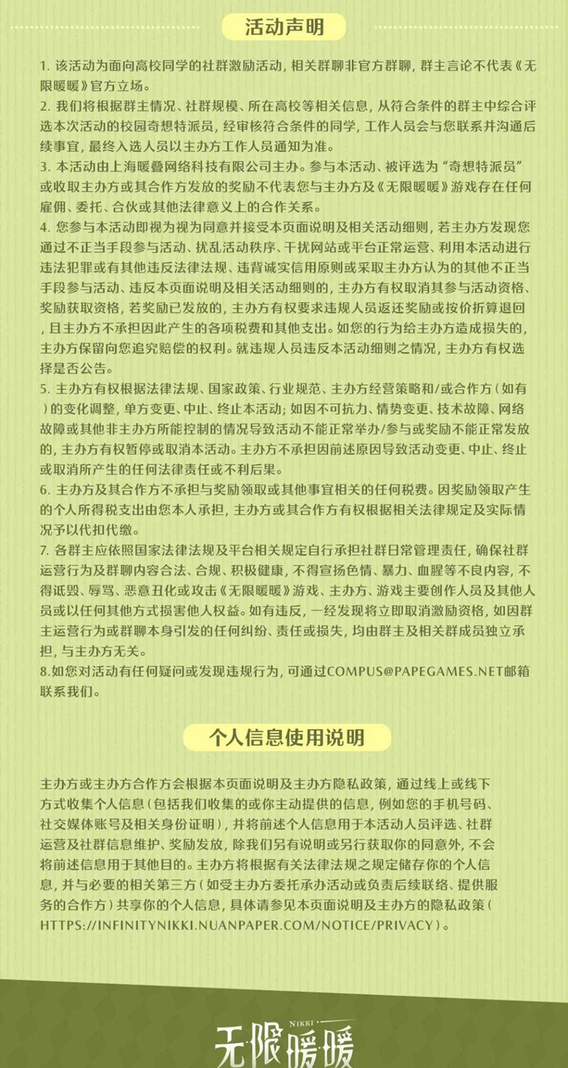 如果你正在运营高校《无限暖暖》玩家交流群,就有机会成为校园奇想特派员,作为连接起校园内搭配师们的桥梁,传递关于奇迹大陆的美好 。
