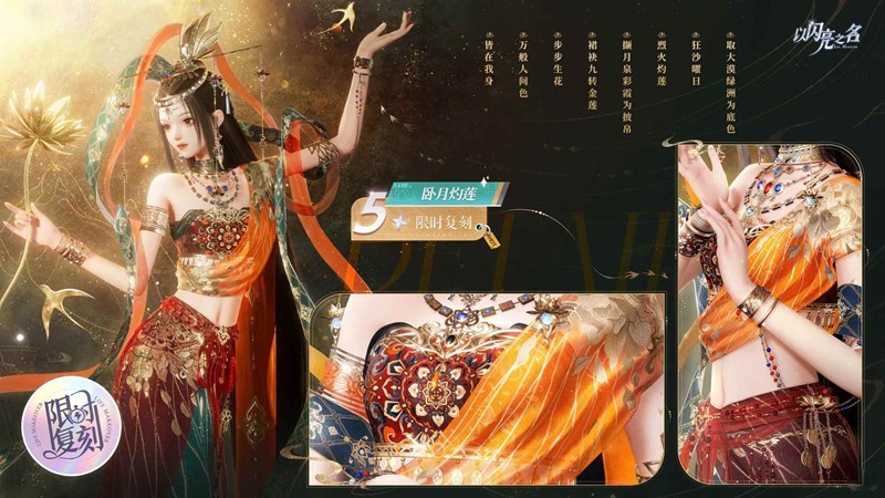 以闪亮之名复刻追光活动,五星套装「卧月灼莲」预览公开~卧月灼莲,踏沙而来,9月23日10:00 - 10月13日23:59限时追光复刻!裙袂九转金莲,步步生花,万般人间色,皆在我身快来探寻以闪亮之名丝路绮梦 ,一起感受异域之美吧~