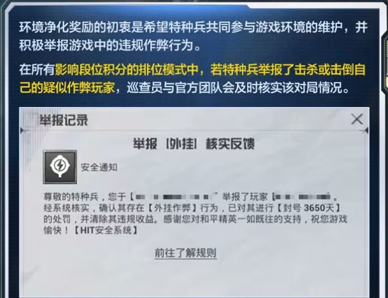 环境净化奖励的初衷是希望特种兵共同参与游戏环境的维护,并积极举报游戏中的违规作弊行为。在所有影响段位积分的排位模式中,若特种兵举报了击杀或击倒自己的疑似作弊玩家,巡查员与官方团队会及时核实该对局情况。