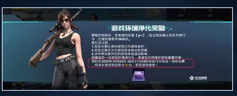 一旦系统实锤对方作弊并被处以3650天封禁,举报成功的特种兵将有机会获得环境净化奖励。其中除了之前已上线的1.5倍上分卡奖励外,新赛季中还将增加段位积分补偿机制:在被作弊玩家击倒/击杀的对局中,若特种兵遭遇段位积分损失,系统会结合本周掉分情况发放积分补偿资格。若玩家当前段位与举报对局时段段位差距过大,我们将会对补偿积分进行折算,保证积分补偿不影响全体特种兵的上分公平性。