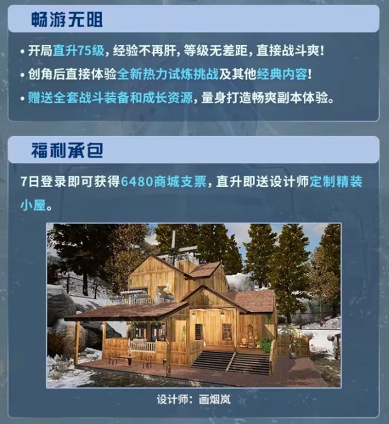 开局直升75级,经验不再肝,等级无差距,直接战斗爽!7日登录即可获得6480商城支票,直升即送设计师定制精装小屋。