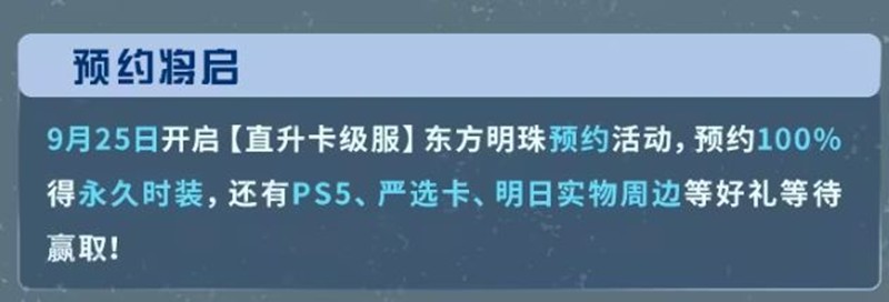 9月25日开启【直升卡级服】东方明珠预约活动,预约100%得永久时装,还有PS5、严选卡、明日实物周边等好礼等待赢取!