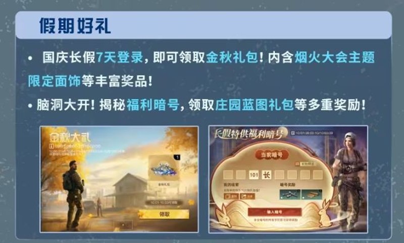 国庆长假7天登录,即可领取金秋礼包:内含烟火大会主题限定面饰等丰富奖品!脑洞大开!揭秘福利暗号,领取庄园蓝图礼包等多重奖励!