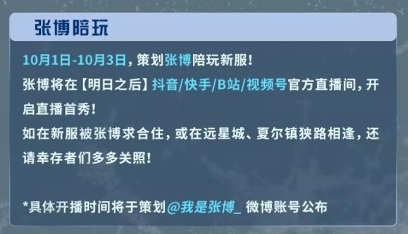 10月1日-10月3日,策划张博陪玩新服!张博将在【明日之后】抖音/快手/B站/视频号官方直播间,开启直播首秀!如在新服被张博求合住,或在远星城、夏尔镇狭路相逢,还请幸存者们多关照!立即预约,准备好在10月1日加入这场全新的冒险吧!