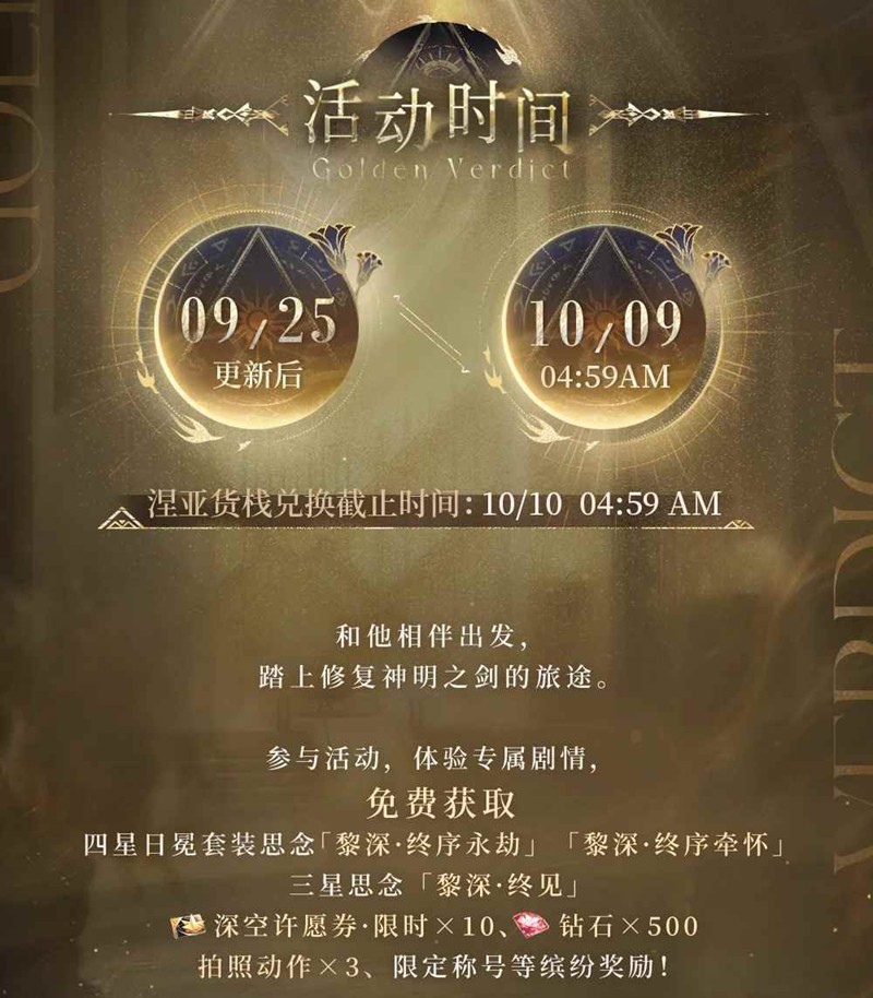 参与活动,即可免费获取四星日冕套装思念「黎深·终序永劫」、「黎深·终序牵怀」、三星思念「黎深·终见」、「深空许愿券·限时*10」、「钻石*500」、「拍照动作*3」、限定称号等缤纷奖励!