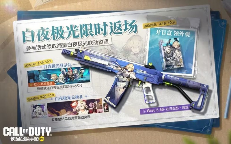 9月26日(本周五),白夜极光兑换礼惊喜来袭。战士们完成任务,收集星钻,即可兑换名片-丹棠、头像-伯利恒、头像框-青瞳、挂饰-雷霆和白夜极光迷彩箱等联动史诗奖励啦,千万别错过哦~