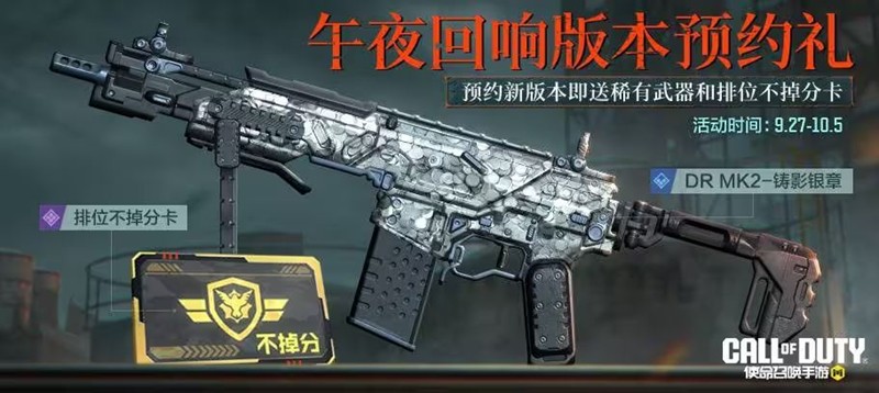 新版本即将上线,预约礼先行登场。9月27日(本周六),战士们预约新版本,即可获得稀有级武器DR MK2-铸影银章、开开开箱和福利点券。