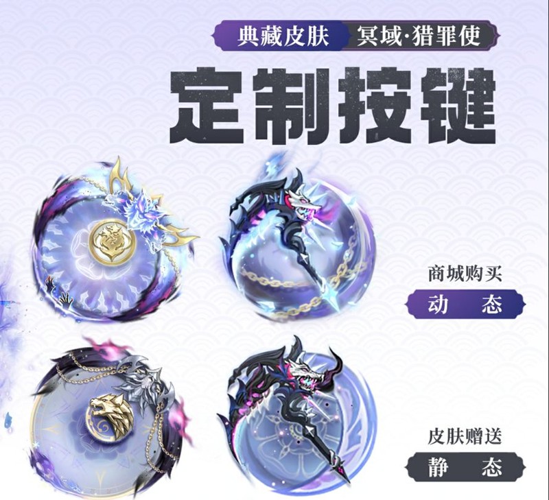 在鬼使黑典藏皮肤首次上架期间兑换皮肤的阴阳师大人,将获赠对应的定制按键——[定制按键·冥域·猎罪使]。此外,专属动态按键[动态按键·冥域·猎罪使]也将同步上架商城,包含拖拽摇杆、普攻点击、装备购买、技能升级的操作动效,售价298勾玉。