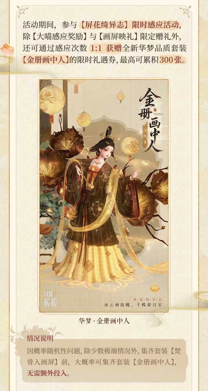 使用「鎏金行炉」礼遇券,玩家有机会获得全新华梦品质套装【金册画中人】及其对应的设计师之影、记忆回响。活动规则如下: