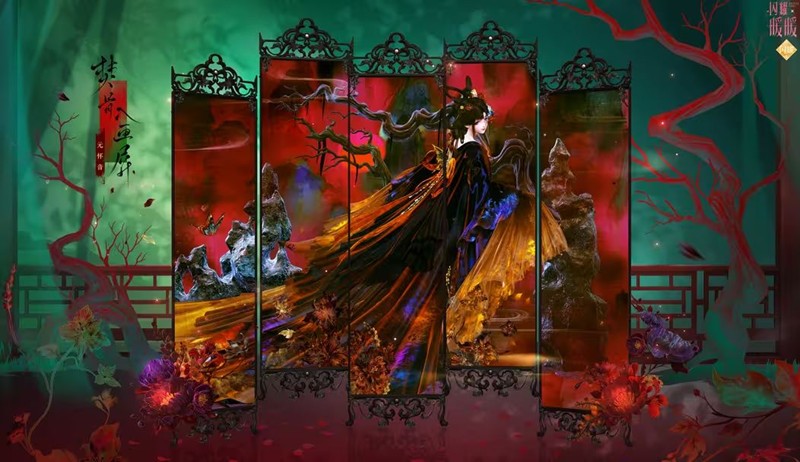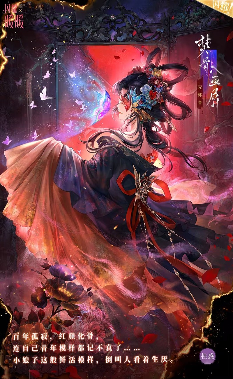 以爱恨为经纬,织残魂为锦缎,新套装“焚骨入画屏”以其独特的设计理念和深邃的故事背景,展现了一种超越常规的美。这种美,是痛苦与挣扎的结晶,是绝望中绽放的妖蝶,让人在临水自照时,不禁对镜花水月中的容颜感到迷惑。