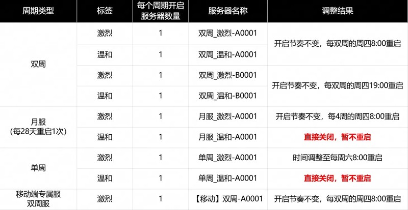 激烈类型服务器(双周_激烈-A0001和双周_激烈-B0001)将保持开启节奏不变,分别在每双周的周四8:00和19:00重启。