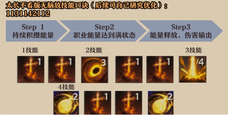关于具体的输出顺序,玩家可参考口诀“1131142112”来记忆技能释放节奏。这一串数字对应的是技能栏中的技能编号,按照此顺序循环施法,能够最大化能量利用率与伤害输出。在实际战斗中,前几轮以低耗能技能快速叠加能量为主,随后衔接高倍率技能打出爆发。塔瑞斯世界中的技能冷却与能量机制紧密关联,因此严格按照循环执行能有效避免技能空档期,保持持续输出压力。
