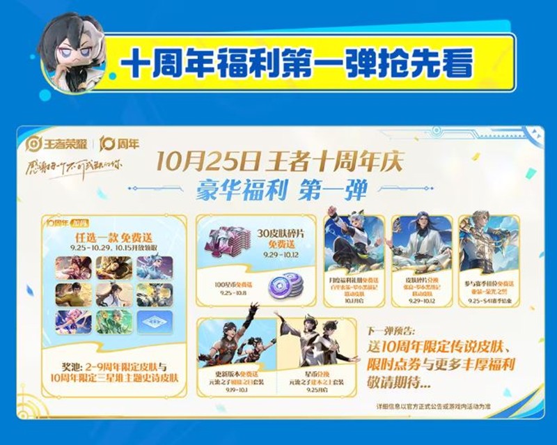 10月25日,王者荣耀十周年庆典将开启豪华福利第一弹。玩家们可以期待包括限定传说皮肤、限时点券与更多丰厚福利的发放。