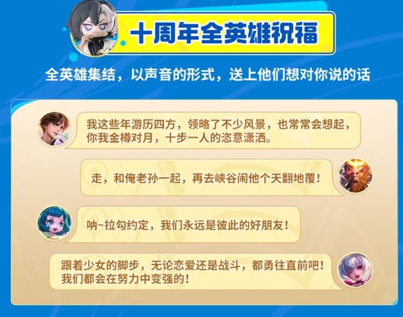 全英雄集结,以声音的形式,送上他们想对你说的话。十周年全英雄祝福不仅展示了游戏的英雄魅力,也为玩家带来了更多的情感体验。