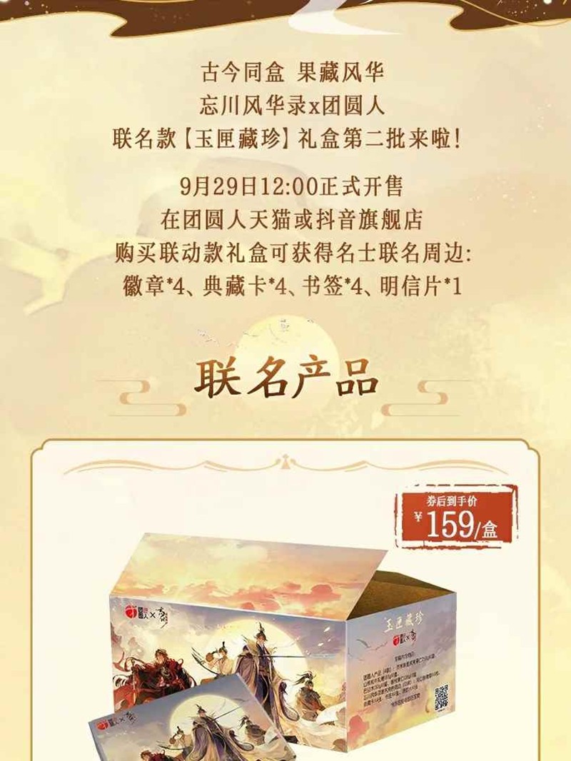 9月29日12:00正式开售在团圆人天猫或抖音旗舰店购买联动款礼盒可获得名士联名周边:徽章*4、典藏卡*4、书签*4、明信片*1