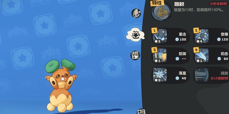 绿耳松鼠的核心机制围绕“能量”系统展开,当能量累积至10点时,会触发其特性“囤积”,使自身防御力提升100%。为了快速叠满能量,抓挠是一个关键技能,每次使用可为自身增加1点能量,耗能低且稳定,适合在战斗初期频繁使用,逐步建立防御优势。