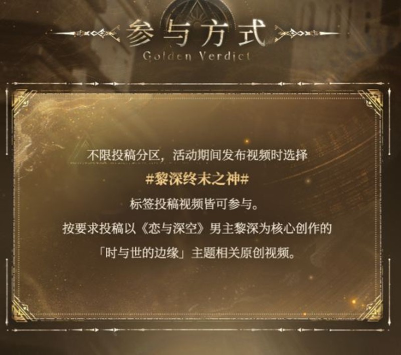 活动期间,玩家可以通过B站赛道参与活动。不限投稿分区,活动期间发布视频时选择#黎深终末之神#标签投稿视频皆可参与。玩家需要按要求投稿以《恋与深空》男主黎深为核心创作的视频内容。