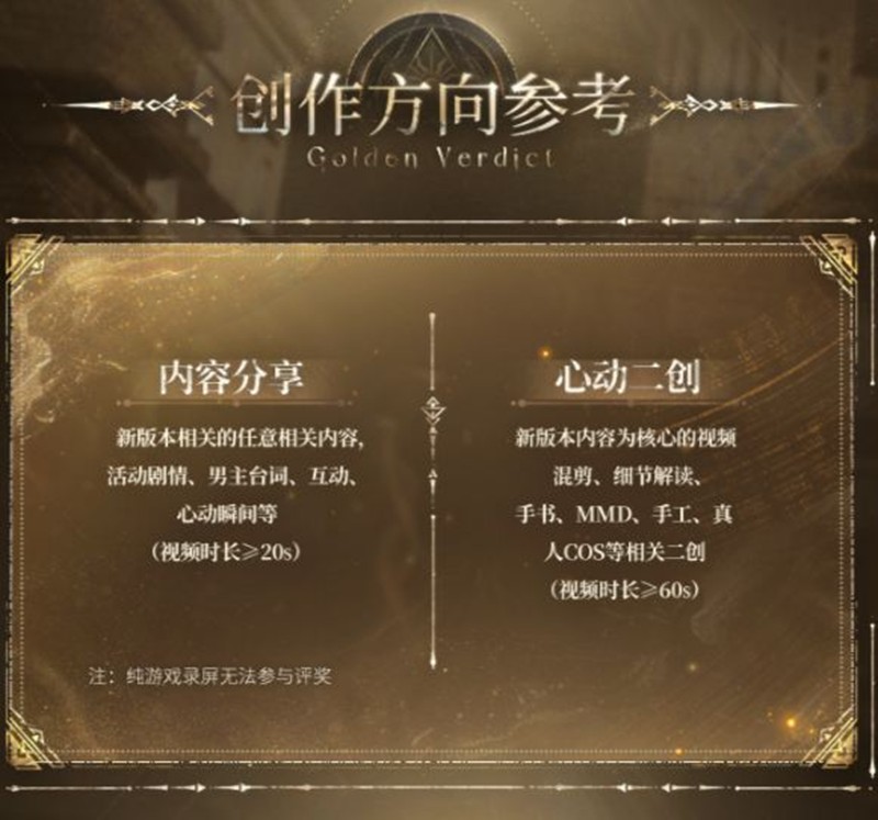 心动二创:以新版本内容为核心的视频混剪、细节解读、手书、MMD、手工、真人COS等相关二创(视频时长≥60s)。