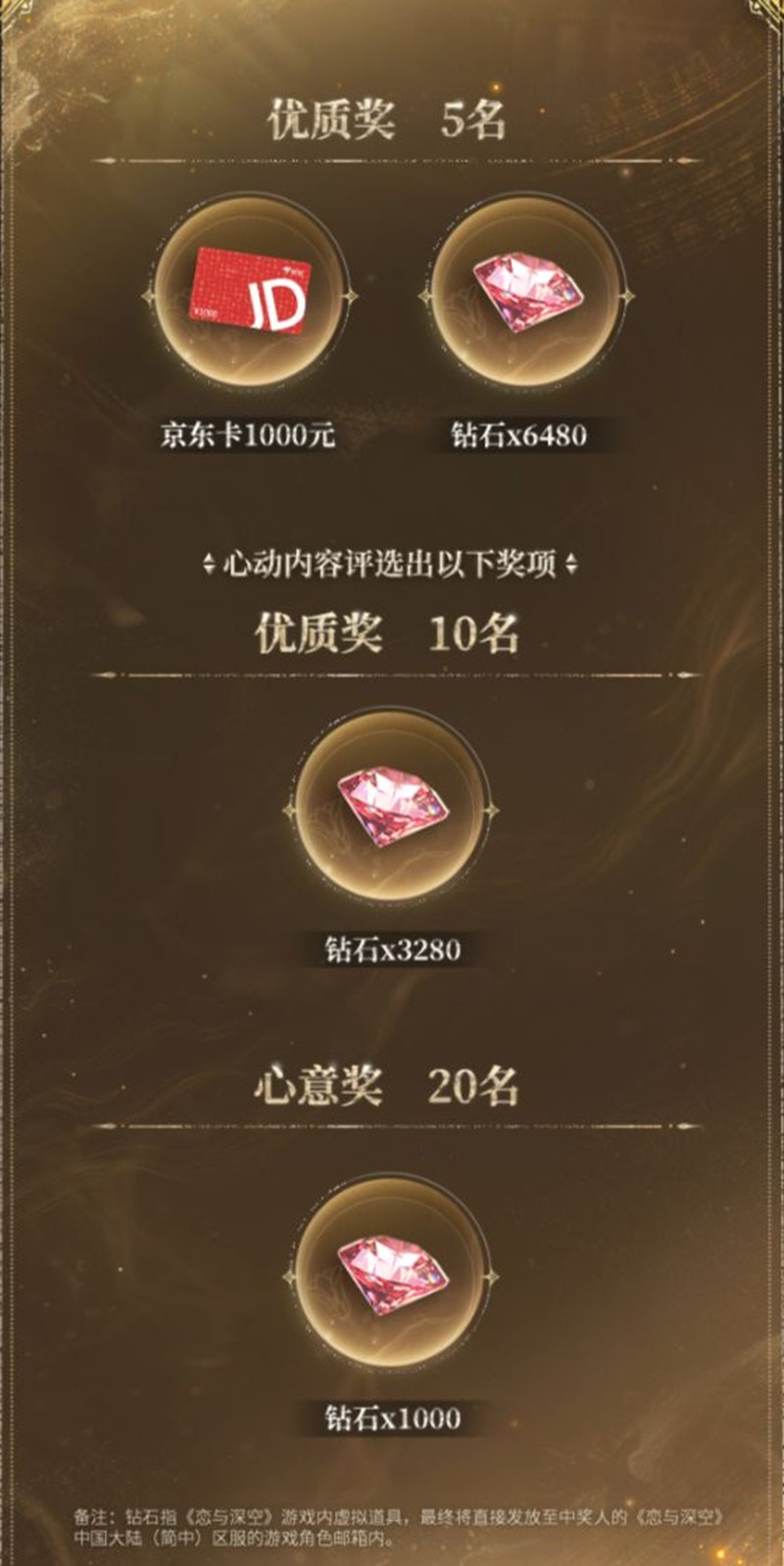 优质奖:5名,奖励京东卡1000元和钻石x6480。