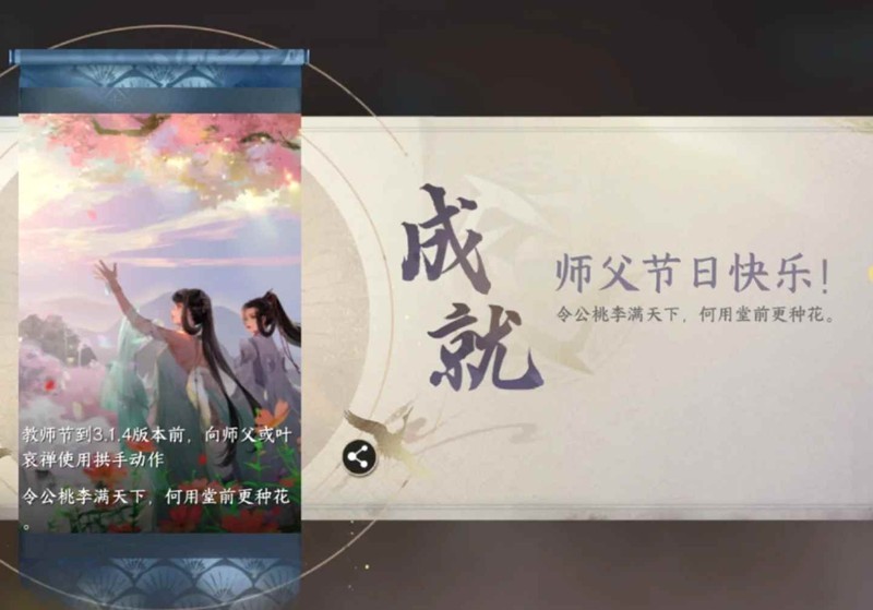 和师父叶哀禅(三清山,1146,802),或者自己结拜的师父使用“拱手”动作可达成成就“师父节日快乐!”并获得绑玉奖励。