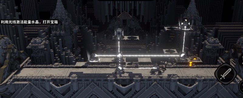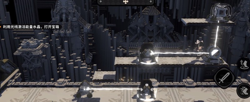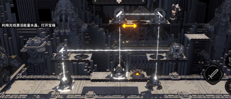 进入地图后寻宝人位于入口处,与其互动即可开启挑战。此关较为简单,首先找到第一个交互点并点击,随后向右移动,使用跳跃到达第二个平台上的交互点,调整镜面使光线准确照射至宝箱位置即可完成。火环在此关作为引导关卡,帮助玩家熟悉基础操作逻辑。