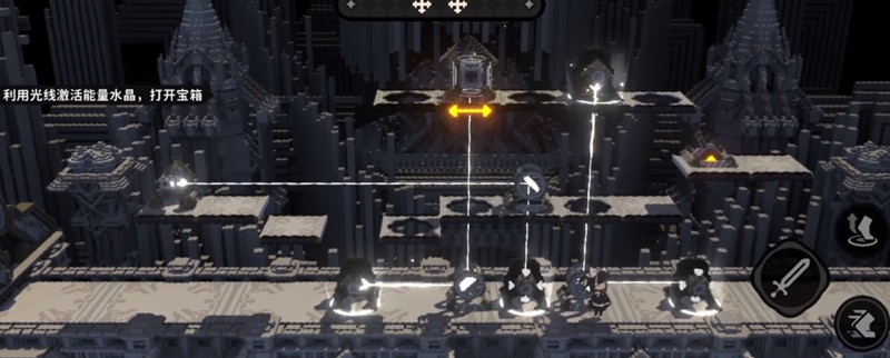 进入地图后优先到达最后一个交互点,翻转镜面使光线垂直向上。接着调节黄色机关,使对应平台上升至合适高度。随后跳跃至与之平齐的平台,再次翻转镜面让光线继续向上投射,完成光路连接。本关强调空间判断力,火环通过简洁结构训练玩家对高度差的感知。