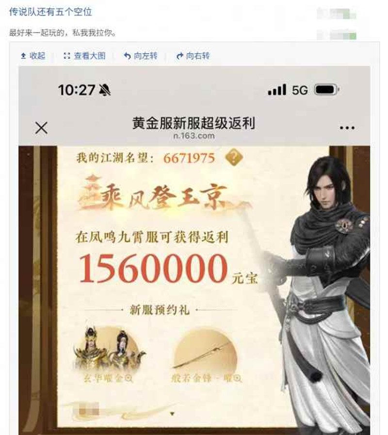 高额返利+刺激夺金的双重刺激下,【凤鸣九霄】服“打最狠的架,夺最多的金”的刺激氛围已初见雏形,这正是精英玩家们最期待的游戏生态。也正因如此,【凤鸣九霄】服成为了精英玩家预约人数最多的服务器!