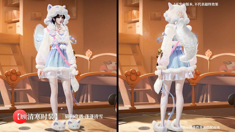 顾清寒的新外观则以“蓬蓬清雪”为主题,设计灵感来源于优雅迷人的猫咪。这款时装将顾清寒塑造成一个拥有清新气质的角色,外观细节充满了冬日的纯净感,让人眼前一亮。