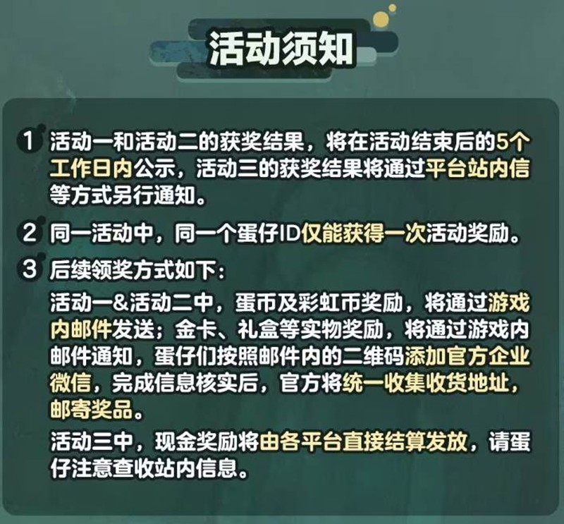 后续领奖方式如下:活动一&活动二中,蛋币及彩虹币奖励将通过游戏内邮件发送;金卡、礼盒等实物奖励将通过游戏内邮件通知,玩家们按照邮件内的二维码添加官方企业微信,完成信息核实后,官方将统一收集收货地址,邮寄奖品。活动三中,现金奖励将由各平台直接结算发放,请玩家们注意查收站内信息。