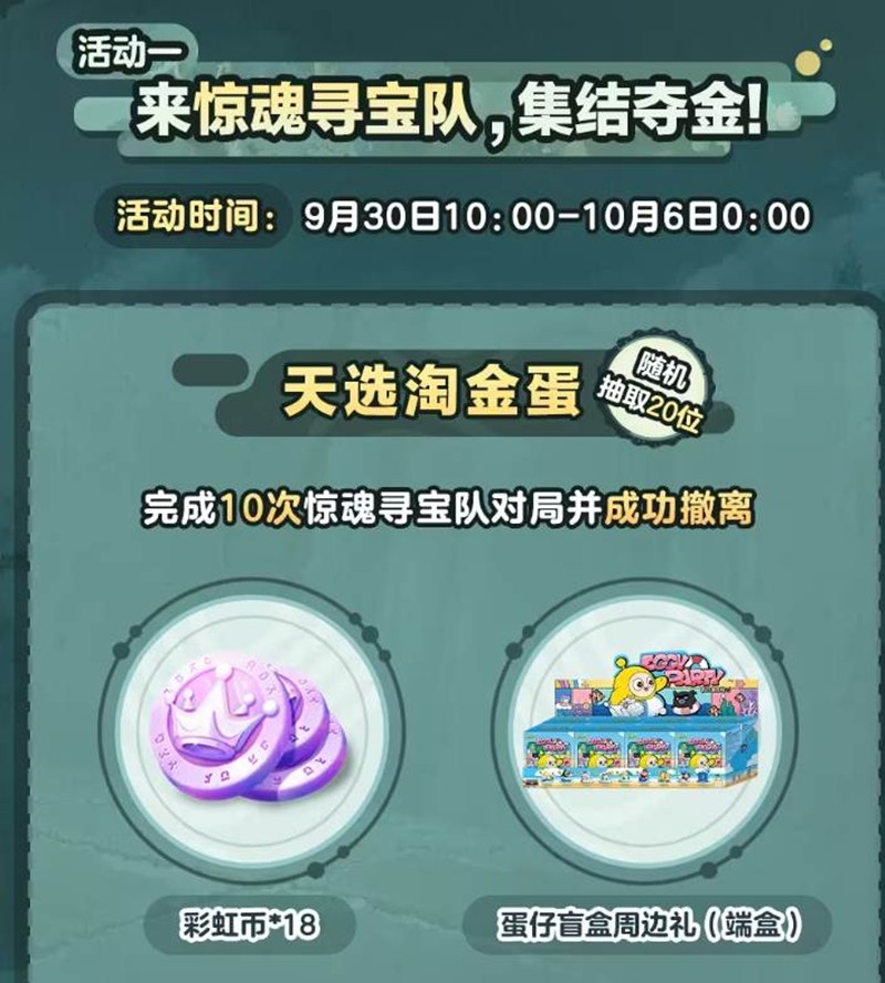 在“惊魂寻宝队”活动中,玩家们需要完成10次惊魂寻宝队对局并成功撤离,即可获得“天选淘金蛋”。此外,带出宝物总价值排行全服TOP10的玩家将获得“宝藏大享蛋”奖励,包括彩虹币*18和蛋仔盲盒周边礼(端盒)。