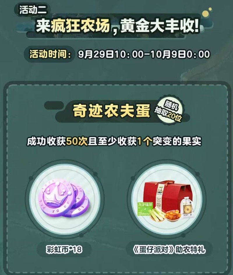 在“疯狂农场”活动中,玩家们需要成功收获50次且至少收获1个突变的果实,即可获得“奇迹农夫蛋”。完成指定任务的玩家将有机会获得蛋币*3280、老凤祥联名新年系列金卡和蛋仔盲盒周边礼(端盒)。