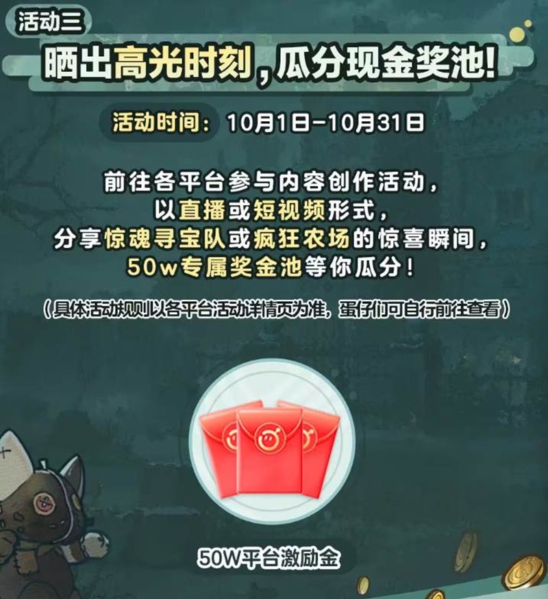 玩家们还可以在各大社交平台分享自己在新玩法中的高光时刻,以直播或短视频形式,分享惊魂寻宝队或疯狂农场的惊喜瞬间。参与者将有机会瓜分50万专属奖金池。