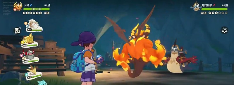 第二只精灵为草系的多菇丁,生命力较强且具备一定反伤机制。此时应切换至罗隐上场,利用其火属性优势形成克制。罗隐不仅输出稳定,技能连贯性也较强,能在多轮交锋中持续施压。尽管多菇丁较为耐打,但在罗隐的高频攻击下仍会逐渐溃败。战斗中注意避免使用草系或水系精灵迎战,以防被反向克制。