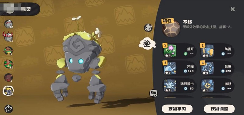 关于技能配置,初期推荐携带冲撞、寄生种子和应激反应三个技能,足以应对大多数PVE场景。随着等级提升,可在后期替换为沙暴、泥浆铠甲和晒太阳等更强力的组合。性格方面建议选择紧张性格,提升物防10%,努力值主加生命与物防。搭配“地脉之玉”道具后,生存能力进一步增强。实战中可先手开启沙暴,随后使用摇篮曲实现控场,只要存活至第二回合便基本达成战术目标。