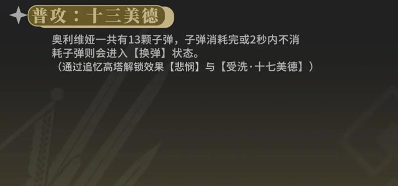 奥利维娅的普攻名为十三美德,攻击形式为远程射击,每次释放会连续发射13颗子弹,象征十三种美德。这种高频次的普攻模式在同级别角色中较为少见,提供了稳定的前期输出能力。由于单次射击数量固定,完成一轮普攻后需进入换弹动作,持续约两秒时间。在此期间角色处于相对脆弱状态,因此建议在掩体后或敌人攻击间隙进行换弹操作,避免被打断影响输出节奏。