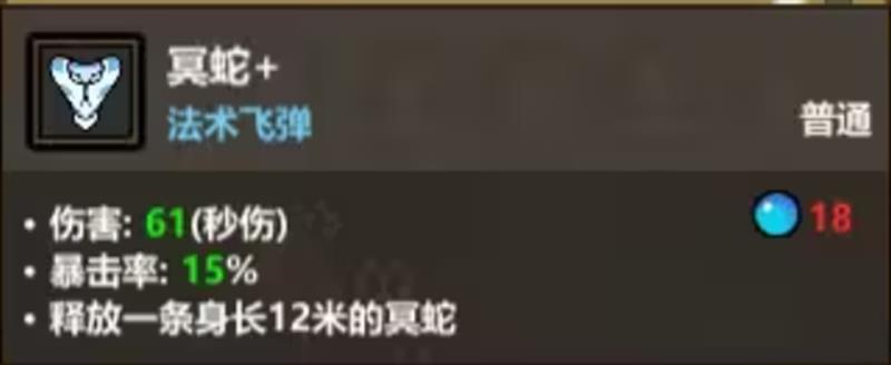 追踪毒蛇流的核心技能是冥蛇。冥蛇作为一种具备自动攻击能力的法术飞弹,能够在释放后自动锁定最近的敌人并进行高速飞行打击。其基础秒伤可达360,单发伤害表现优秀,初始飞行速度为每秒3.5米,命中效率较高。该技能自带30%暴击率,在前期就能打出可观的爆发。冥蛇的飞行路径会对穿过的敌人造成伤害,并且在命中目标后可多次触发伤害效果,特别适合在单体战斗中持续压制对手。