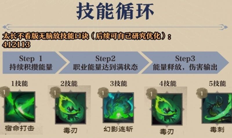 在实际战斗中,推荐采用“412113”这一技能释放序列来优化输出节奏。该口诀对应的是淬毒、幻影连斩等技能的施放顺序,其中淬毒需作为起手技优先挂上,确保目标进入中毒状态。随后通过幻影连斩与普攻叠加连击,触发更多毒层积累。当毒层达到上限后,利用毒刺进行引爆,再衔接宿命打击打出爆发,整个过程环环相扣,尤其适用于BOSS战场景。