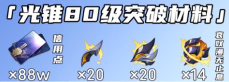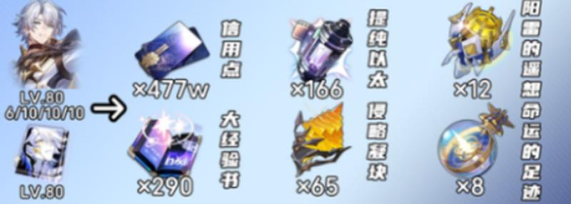 除了角色突破外,光锥和行迹的升级也需要大量资源。总共需要477万信用点和290个大经验书。其他材料需求包括166个提纯以太、65个侵略凝块、12个阳雷的遥想和8个命运的足迹。哀叹漫无止境还需要蓝色76个、紫色91个、金色87个,狼牙需要蓝色22个、紫色81个、金色154个。