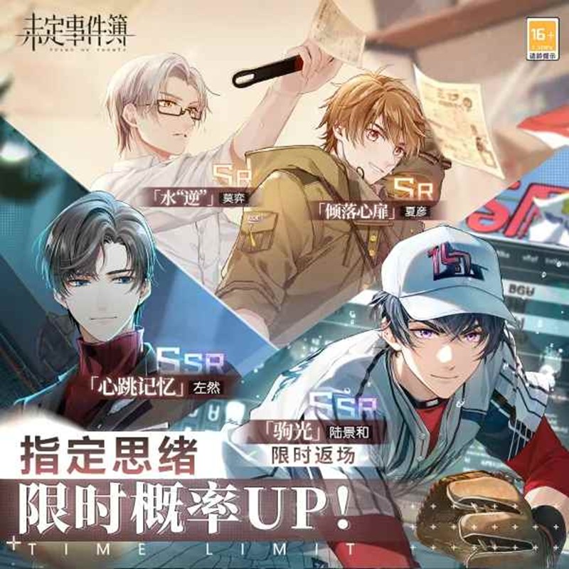 未定事件簿轮替女神之影更新预告来啦~ 陆景和SSR【驹光】明日限时返场开启,活动期间,轮替女神之影中左然SSR【心跳记忆】、陆景和SSR【驹光】、夏彦SR【倾落心扉】、莫弈SR【水“逆”】获取概率提升,一起来和小编看看吧~