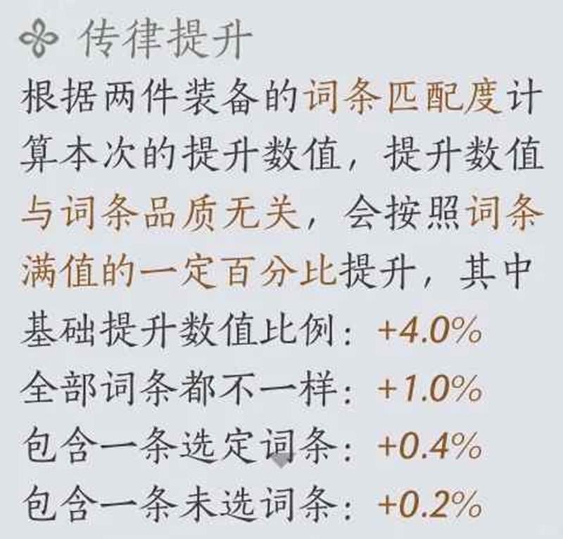 传律:利用满调律96阶金装(无需定音)喂到已承音的新96阶装备(胚子),用于提升其词条数值。