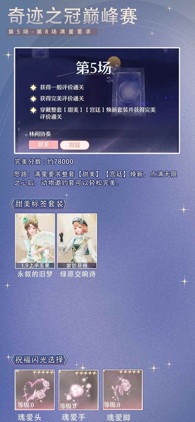 > 第5场符合标签的套装有很多,焕新泡泡套也能过关(无限之心要点点哦)。 【甜美】【宫廷】标签套装有【咏叙的旧梦】、动物邀约套【绿原交响诗】,用动物邀约套焕新过关毫无压力。